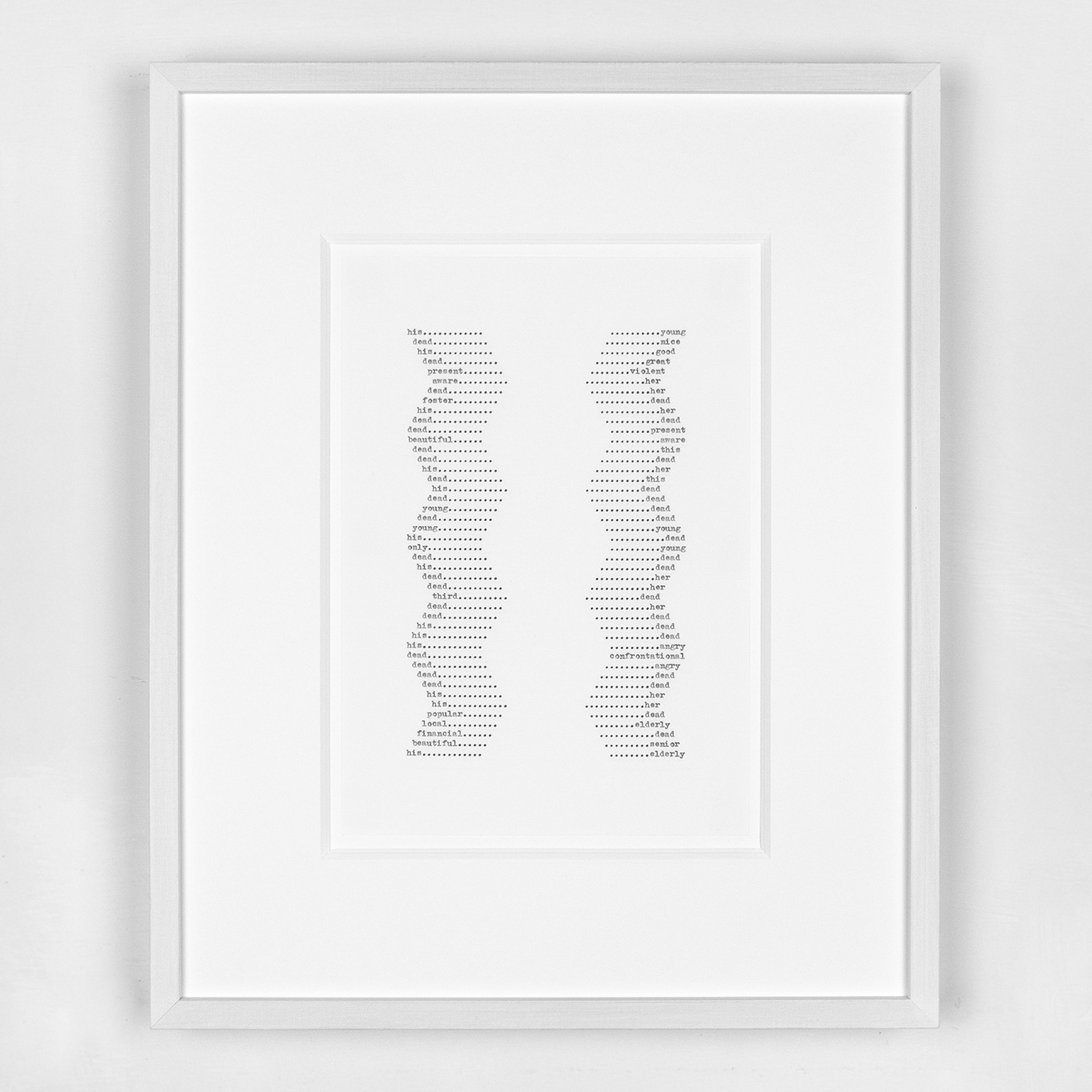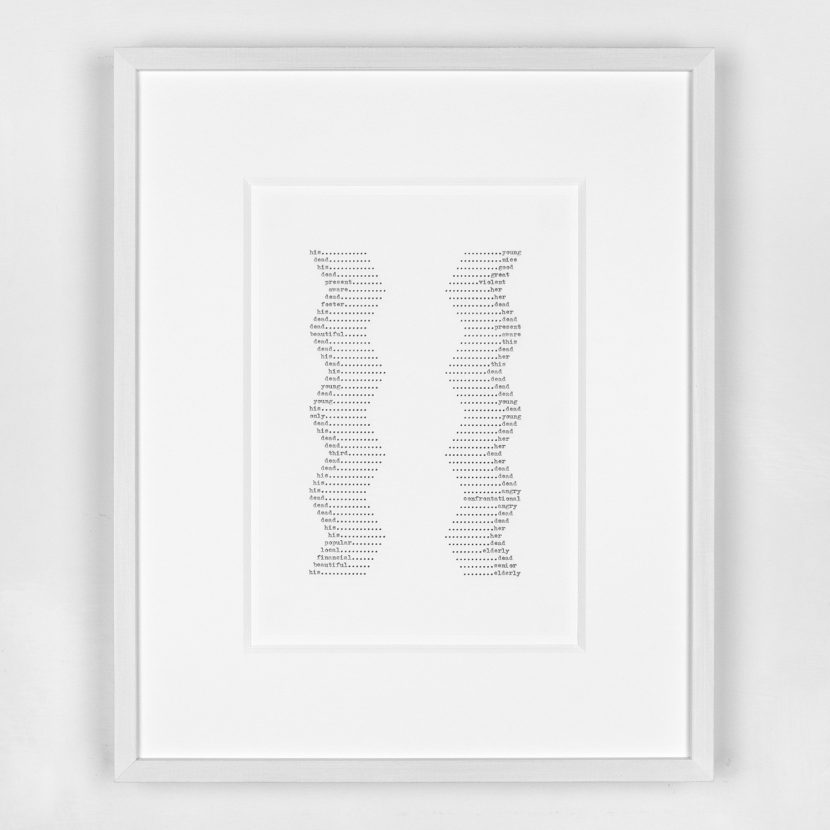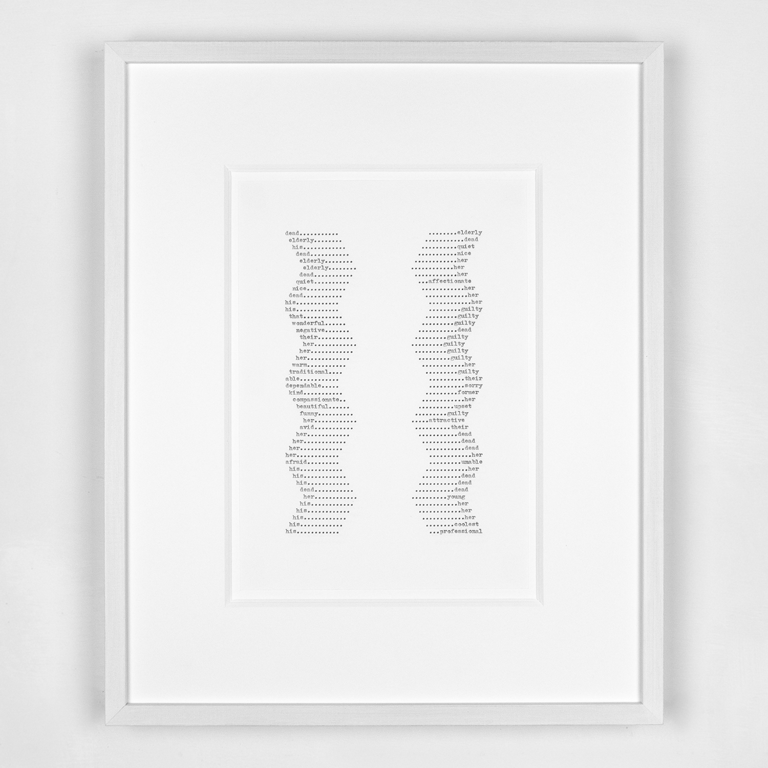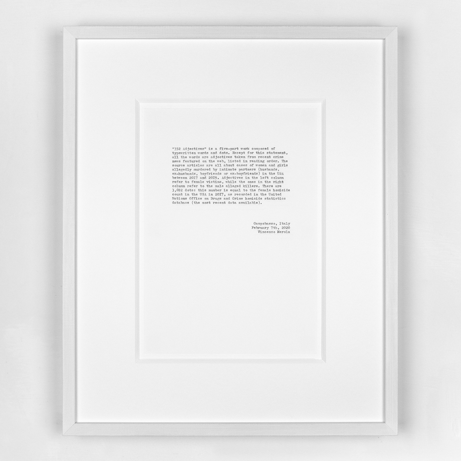 352 Adjectives | 2020 | Dattilografia su carta di cotone / Typewriting on cotton paper | 5 elementi 29,7×21 cm (49×40 cm in cornice) / 5 parts 29,7×21 cm each (49×40 cm framed)