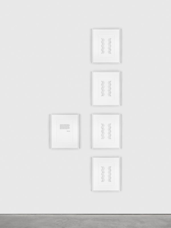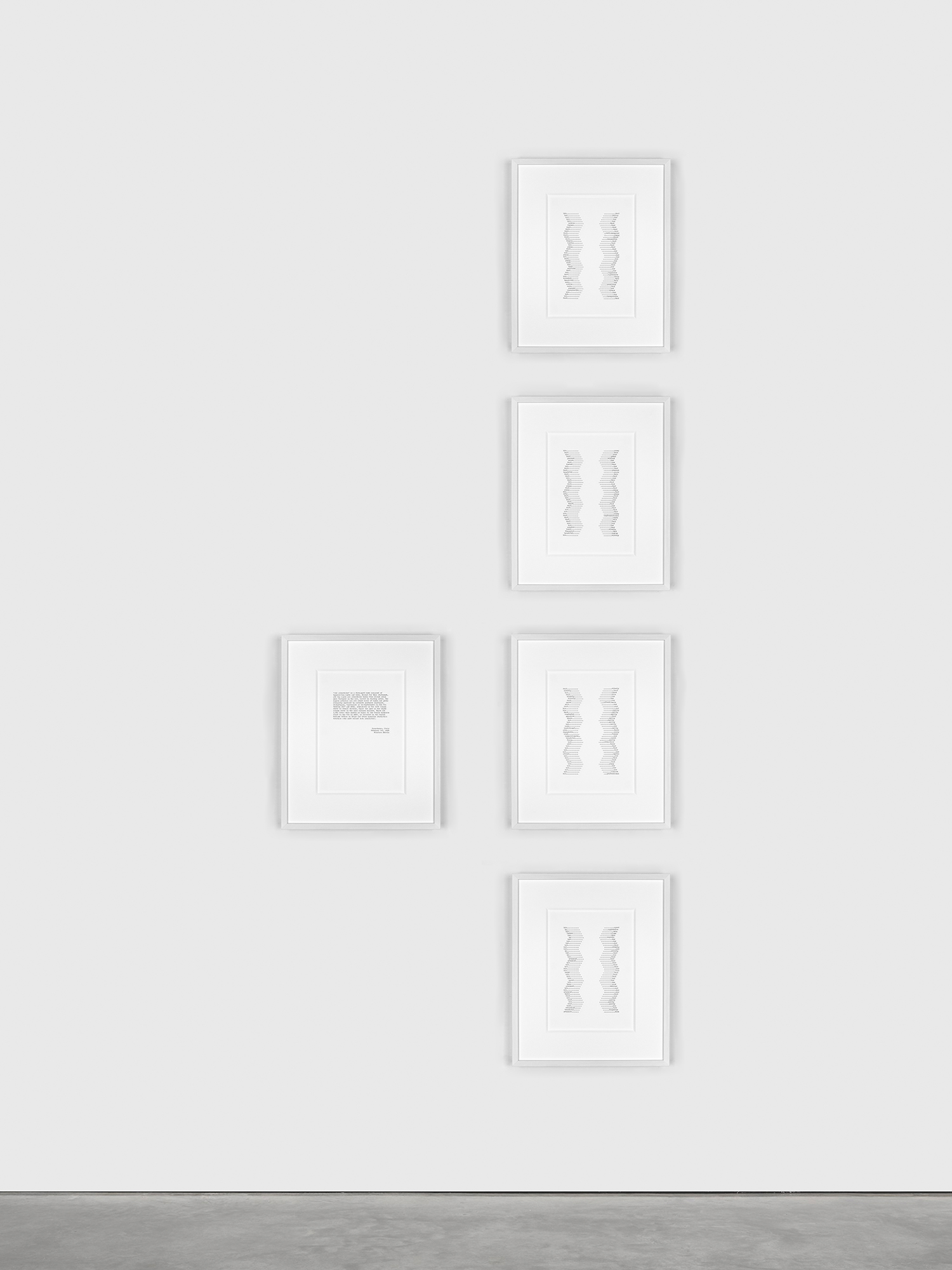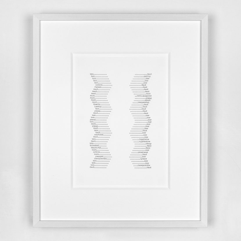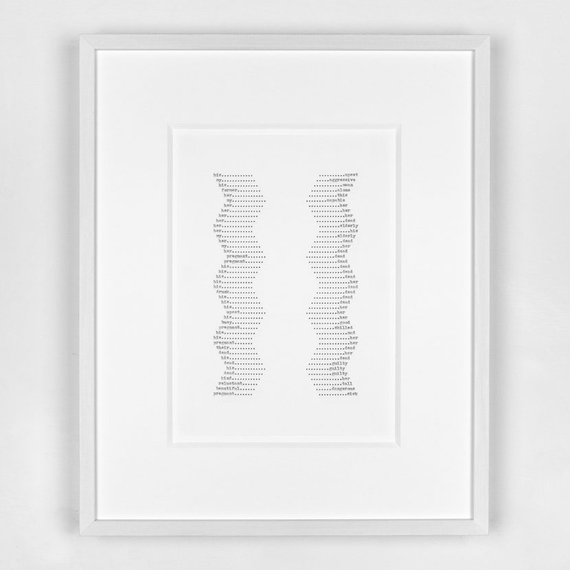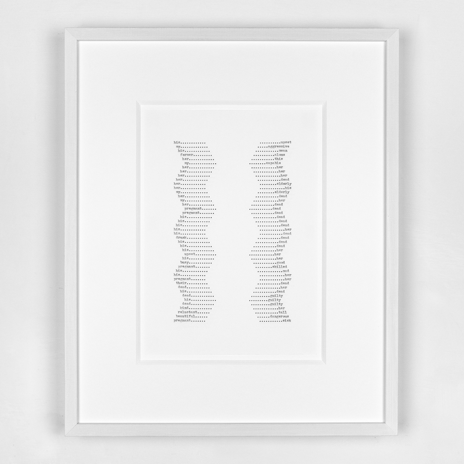 352 Adjectives | 2020 | Dattilografia su carta di cotone / Typewriting on cotton paper | 5 elementi 29,7×21 cm (49×40 cm in cornice) / 5 parts 29,7×21 cm each (49×40 cm framed)